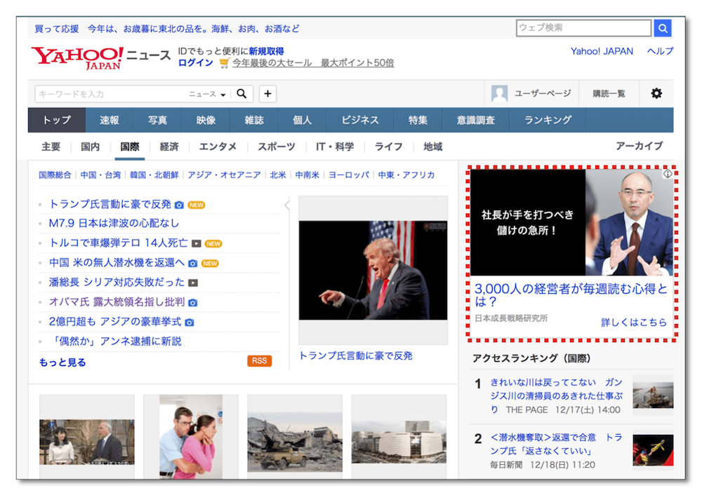 それ(集客の自動化)を現時点で可能な限りで形にしているのが、弊社で『インターネット広告【三種の神器】』と呼んでいる、1)Yahooプロモーション広告、2)Googleアドワーズ、3)Facebook広告、の3つです。実際の広告掲載面はこんな感じになります(弊社の広告枠は赤点線になっています)。
