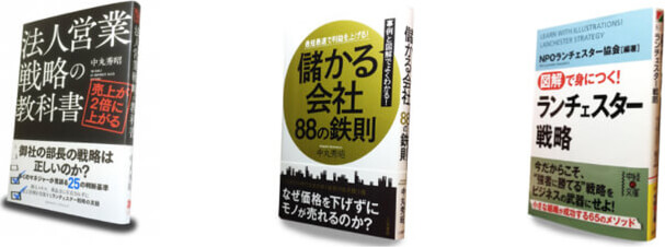主な著書に『売上が2倍に上がる法人営業戦略の教科書(三省堂書店・東京駅一番街店/ビジネス書週間ランキング第1位、文教堂・浜松町店/ビジネス書週間ランキング第2位)、『儲かる会社88の鉄則(Amazon【企業経営部門】第1位』、『図解で身につく!ランチェスター戦略(共著)』がある。