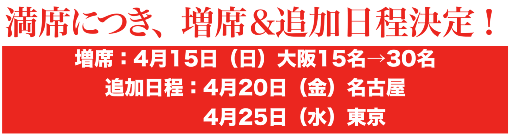 | 東京(追加開催) | 残席2名→ 満員御礼 | |